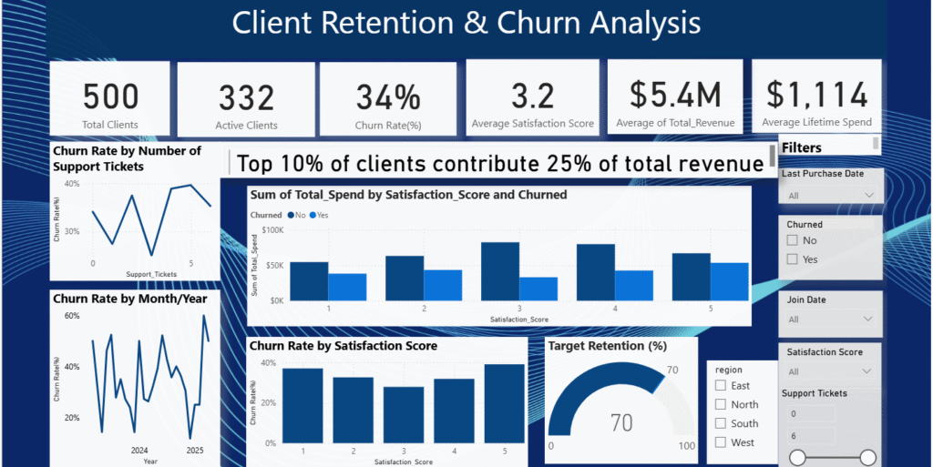 - The “Target Retention (%)” gauge shows 70% retention target , aligning with the current 66% active client rate (100% – 34% churn).